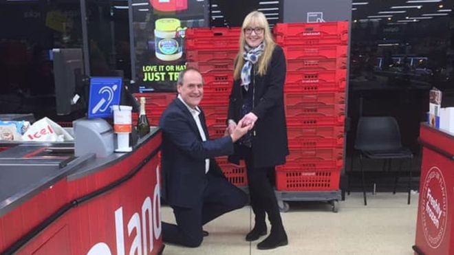 Once inside, Robert dropped down on one knee in an empty aisle within the supermarket and popped the question to his shocked girlfriend, who graciously accepted the proposal.